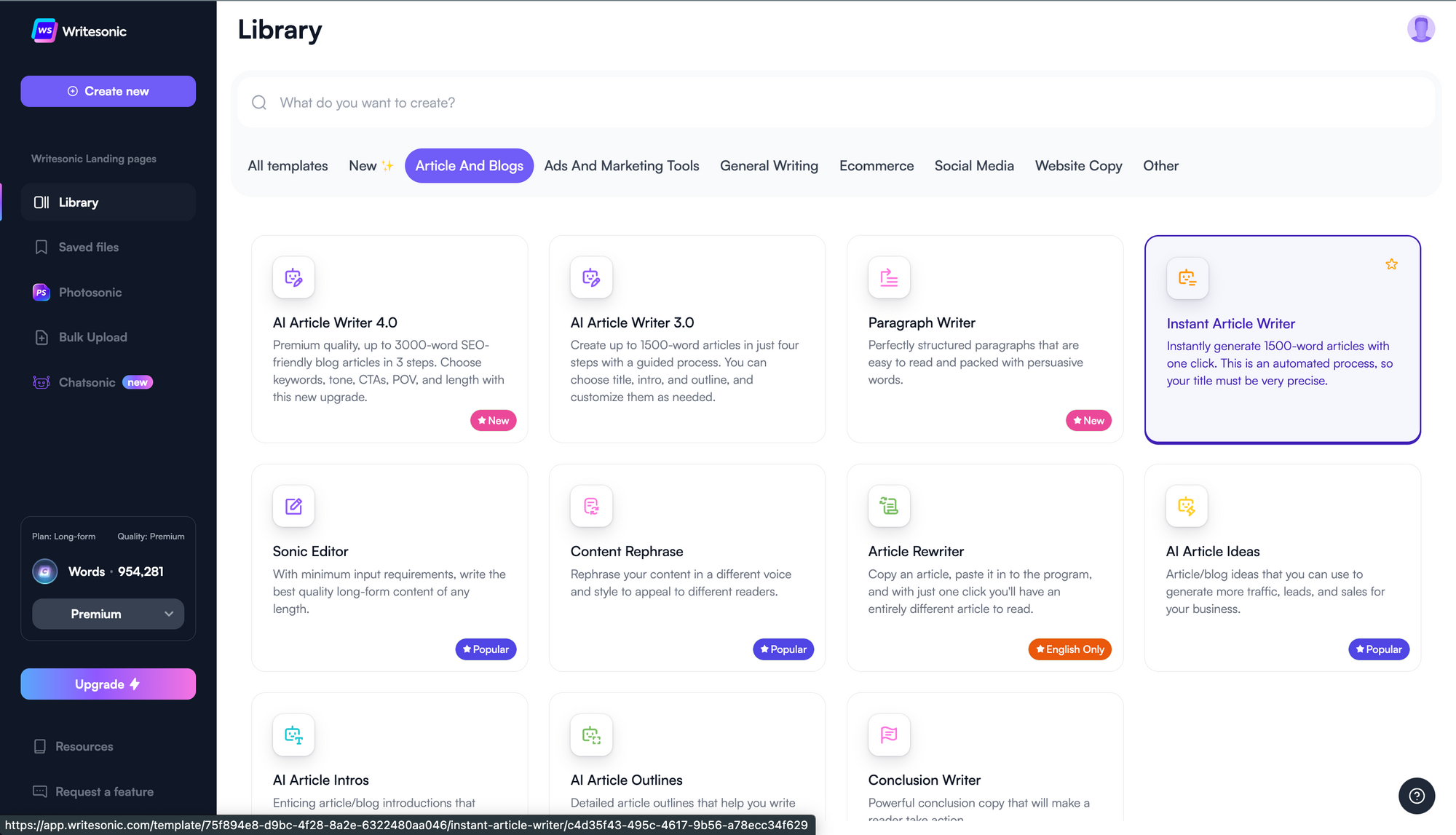 Step 2: You can see all the article writing tools there. Choose “Instant Article Writer.”