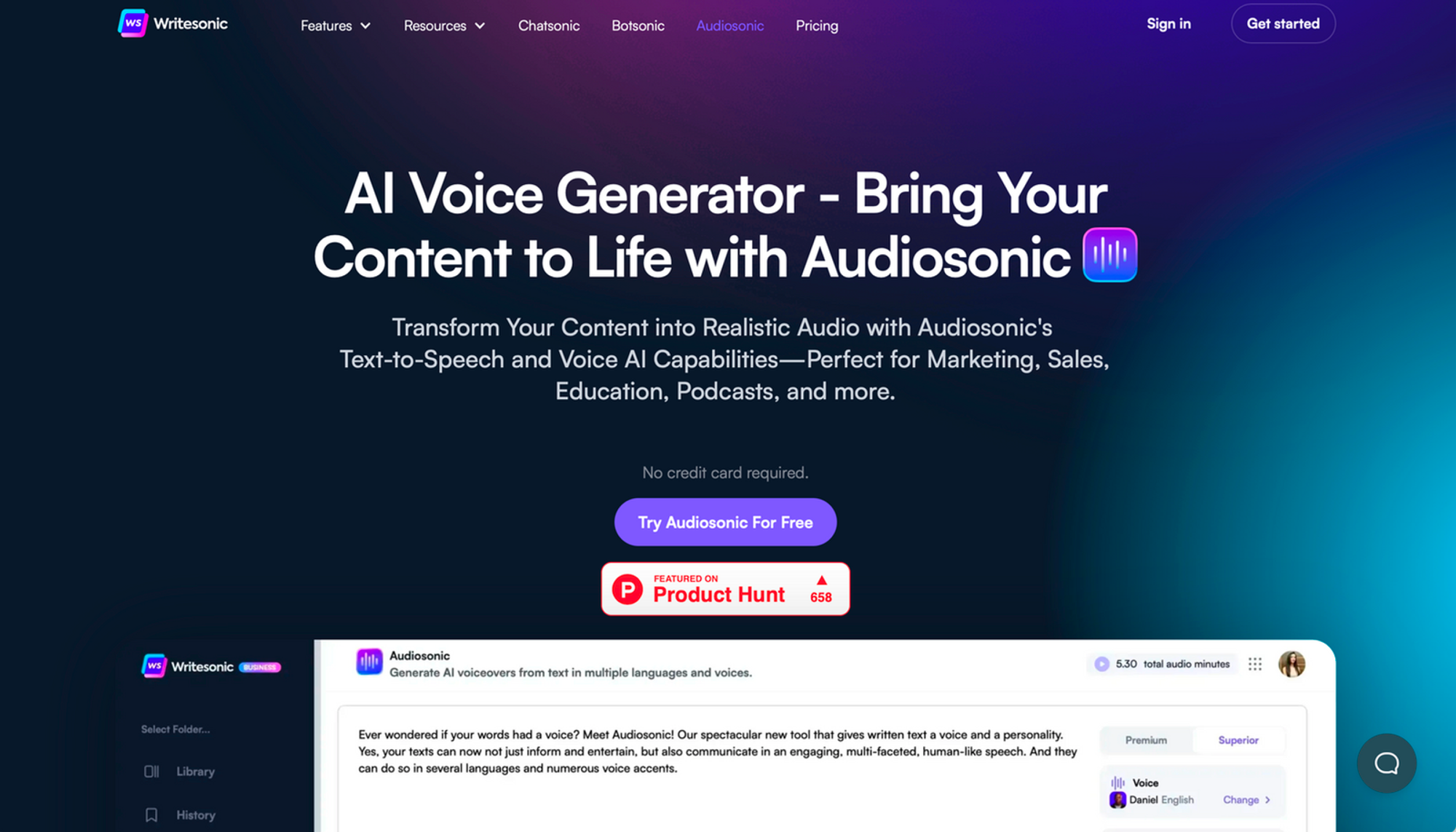 Audiosonic stands out from the crowd. Along with being an AI voice generator from Writesonic, it is an all-in-one tool for all your content creation needs. With Audiosonic, you're not just upgrading your audio, you're elevating your entire content game.