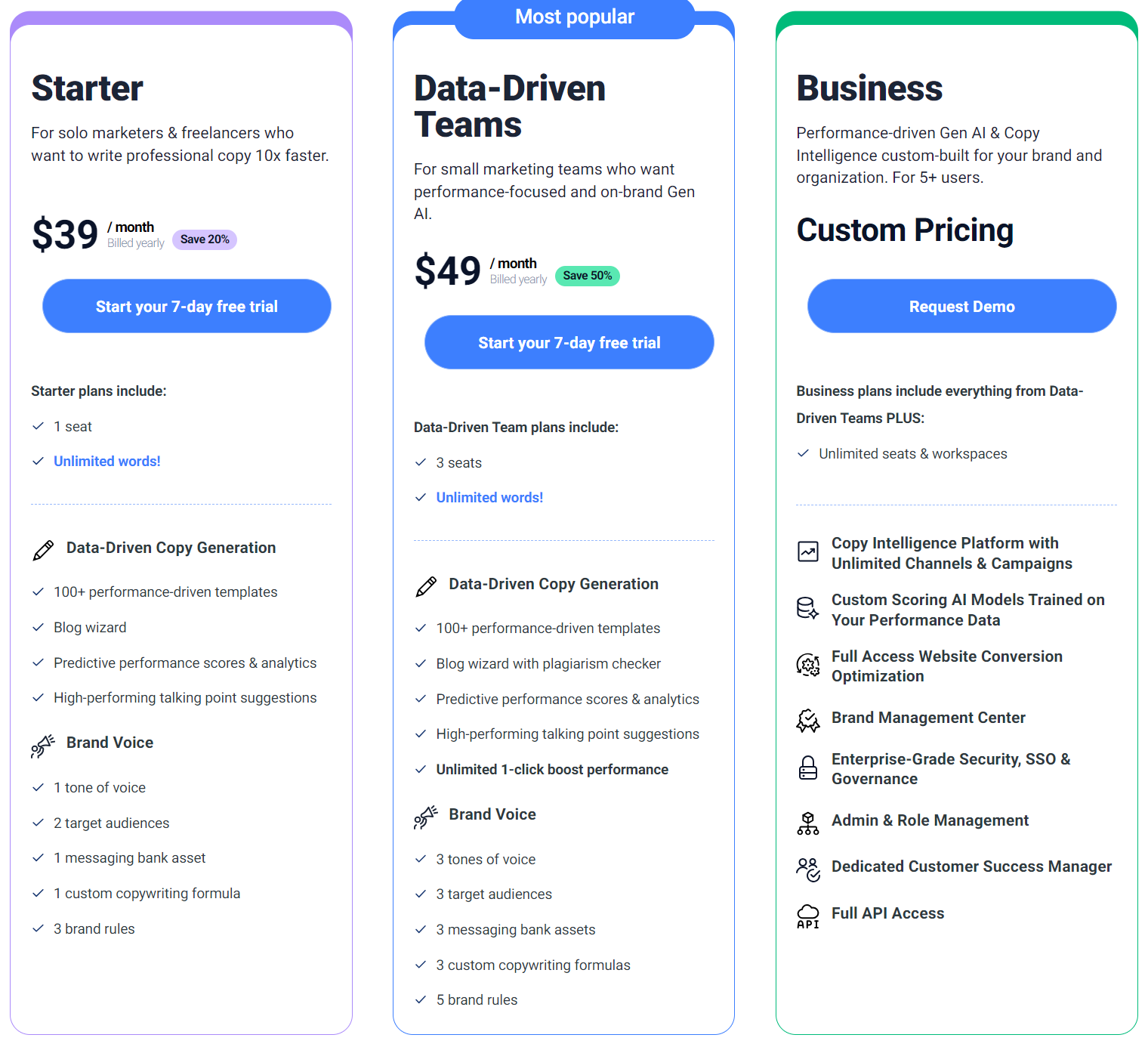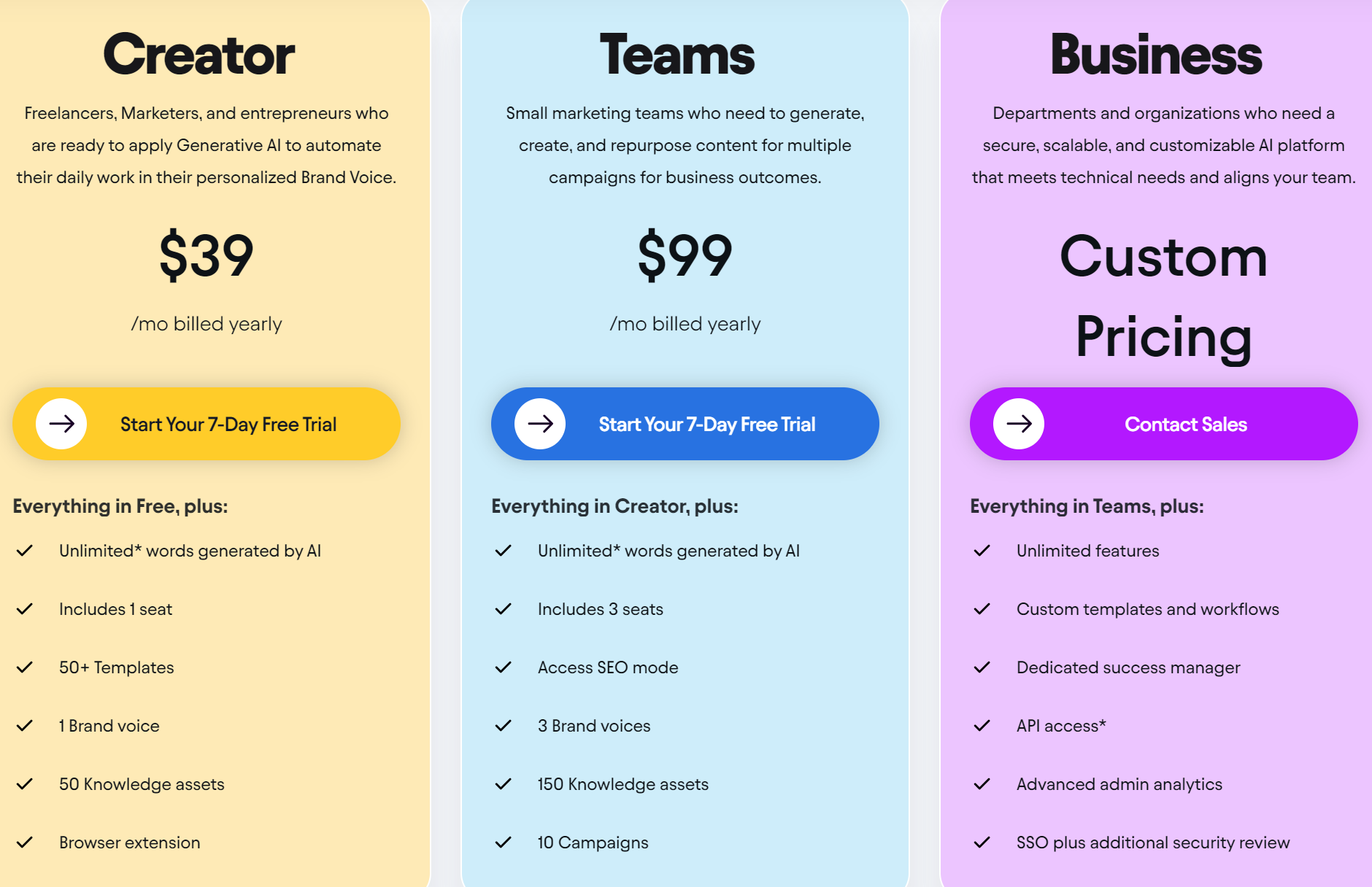 Creator: This plan provides unlimited words at $39 per user, allows you to create one brand voice, has 50+ templates to choose from, and more.