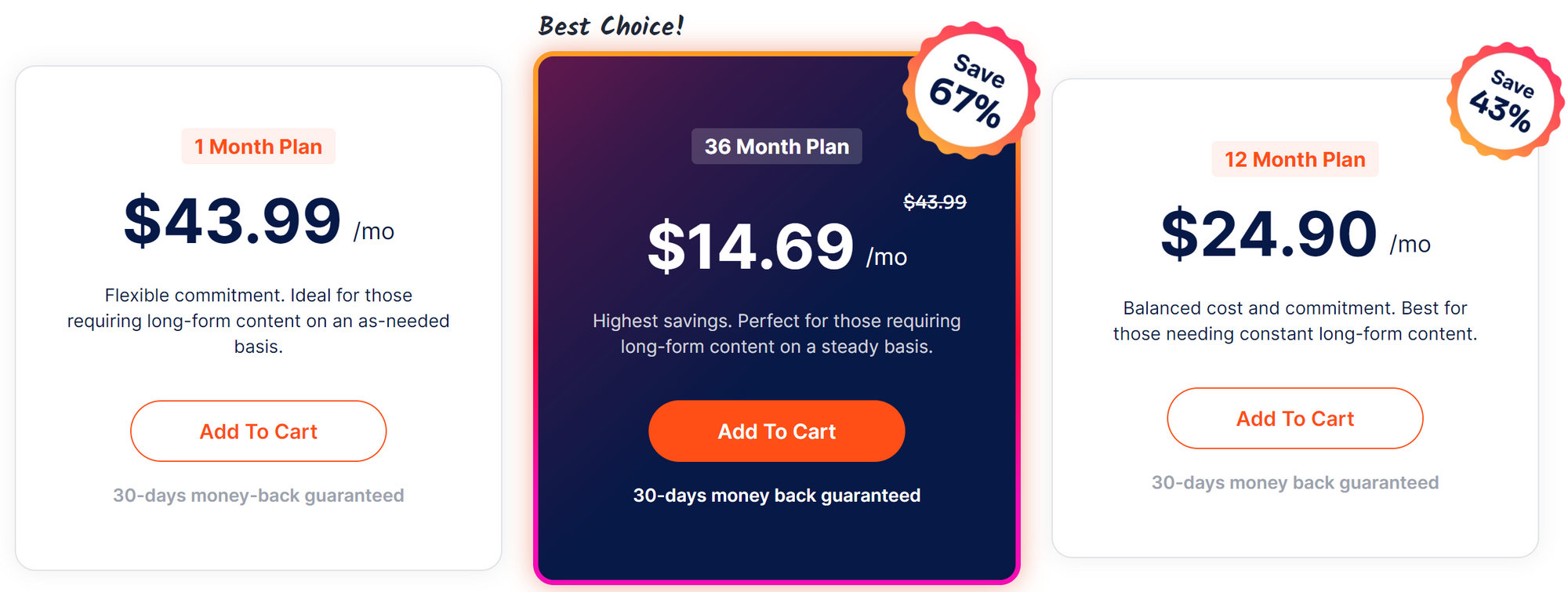 The 36-month plan offers the highest savings at $14.69 per month, allowing users to save 67%.